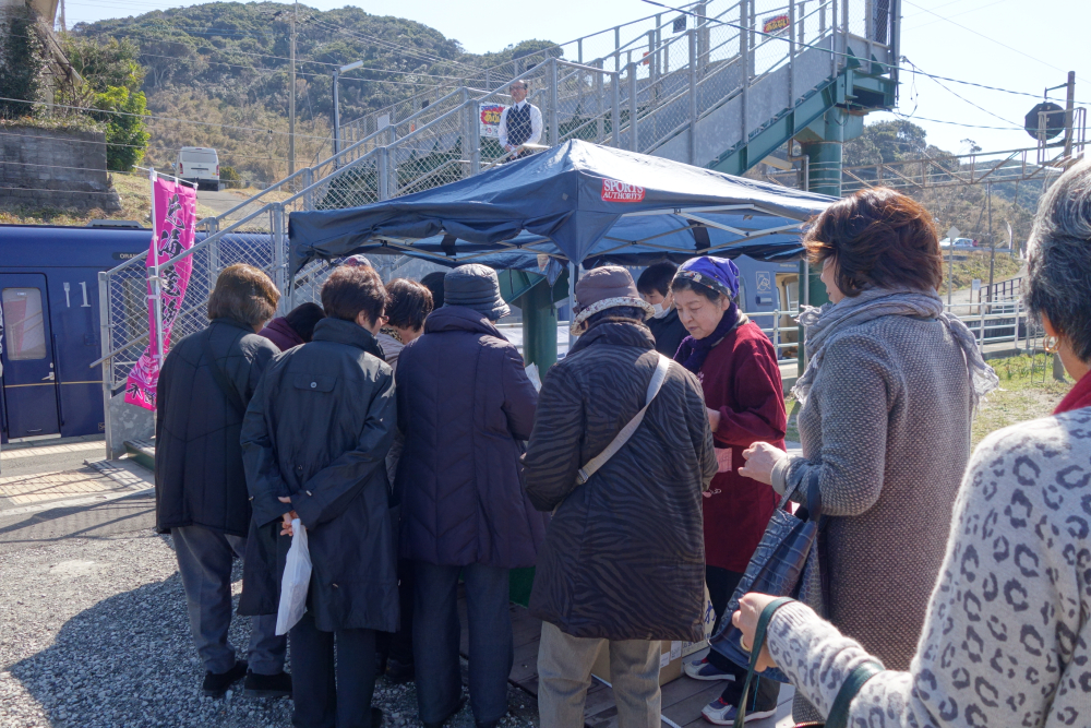 途中の駅で料理を積み込むために「おれんじ食堂」は何度も停車する。その間、列車を降りた乗客に、炭火で目刺しを焼いて振る舞ってくれたり、小さなケーキをかごに入れて差し出してくれたり…。いずれも「ちょっとだけ」だけど心がこもったもてなしも魅力のひとつ。その土地ならではの土産物を買うことも楽しい