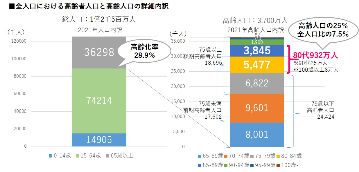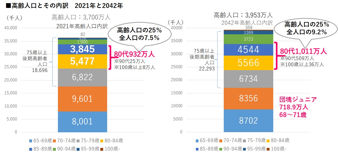 80代市場への取り組みは、2042年の高齢人口最大時を考えても今もう始めるべきと考える。2042年、80代人口は今から80万人増え、日本の人口は1,600万人減少。相対的に、80代ニーズの重みは増す。高齢者を支える人口が大きく減ることで、80代の自宅・地域での暮らしを如何に支えるか、その課題もまた大きくなる。