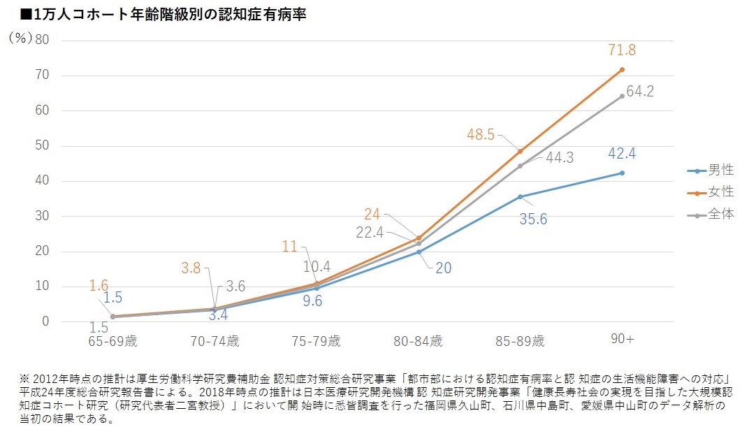 これらグラフが示しているように、80代後半で、介護保険認定率や認知症発症率はほぼ倍になる。先ほどのグラフ「80代の世帯、種類・人員について」で示すように、80代後半で「施設入居者」は20万人増加している。