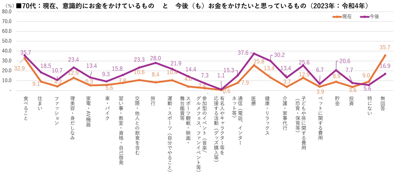 何が「大切なもの・こと」がわかる、線の動きは「現在」と「今後(も)」に大きな違いはない。「特にない」と「無回答」は、「今後(も)」では減少していて、「食べること」以外ほぼすべての項目に対して、「今後(も)お金をかけていきたい」は「現在」の倍近い数値を示している。70代は今お金をかけている対象についてもっと必要、あるいは楽しみたいと考えていると読み取ることができる。