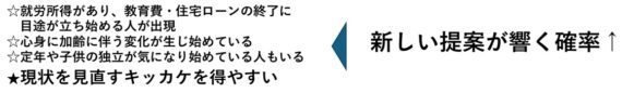 やるべきことに日々を埋められがちなプレシニアの意識に入り込む工夫が必須だが、「よりよく歳をとる。よりよく老いる」を身近にする仕組みが大切ではないだろうか。
