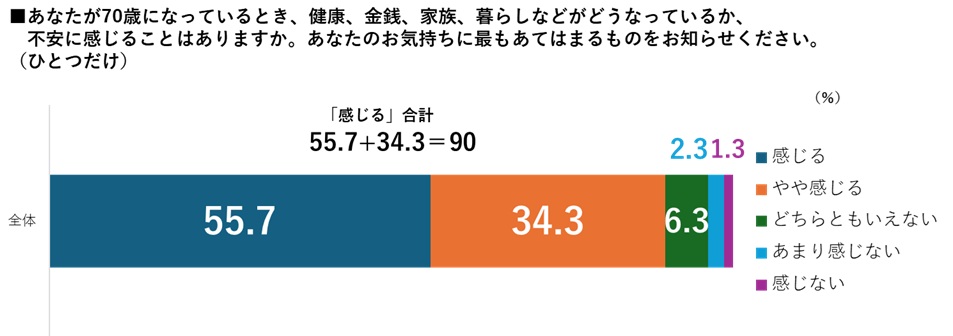 当室が2023年度に実施した調査(45~59歳男女)では、70歳頃について「健康、金銭、家族、くらしなど」について不安を感じることはあるか?という問いに対して55.7%の人が不安と答えている。