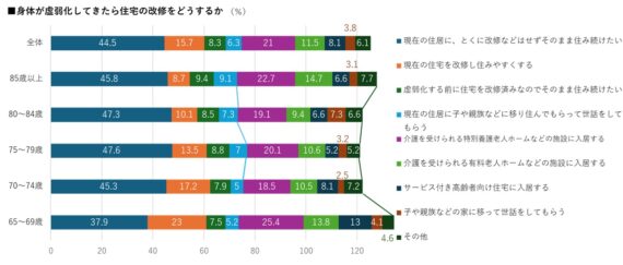 「身体が虚弱化してきたら住宅の改修をどうするか」(複数回答)という問いに対して、高齢者は年齢に関係なく全体的に「現在の住居に、とくに改修などはせずそのまま住み続けたい」が一番多い。65-69歳で見ると、2番目は「介護を受けられる特別養護老人ホームなどの施設に入居する」。3番目に「現在の住宅を改修し住みやすくする」。そして「介護を受けられる有料老人ホームなどの施設に入居する」「サービス付き高齢者向け住宅に入居する」と続き、全体的に施設でのくらしを挙げる人は多い。そしてどこにどう住むか、多様な方向性をあげているのもこの年代の特徴だ。