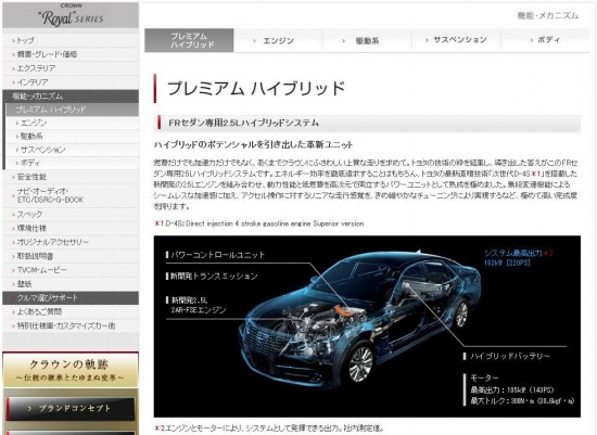 ↑クラウン「プレミアム・ハイブリッド」のページ。10ポイントの小さな文字で書かれた1行65字の文章は、「シニアは読まなくていい」というメッセージなのだろうか(筆者)。