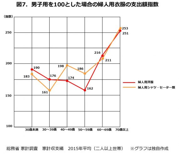 高齢になればなるほど、男女格差が激しくなっていることが一目瞭然だ。70代以上では、洋服もシャツもセーターも、女性が250%も多く支出している。