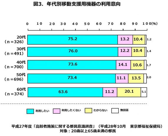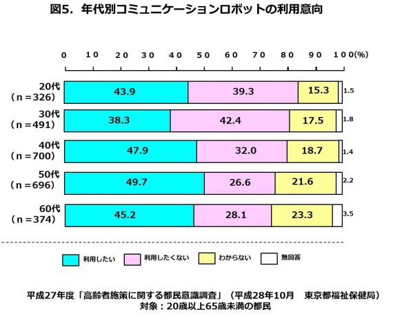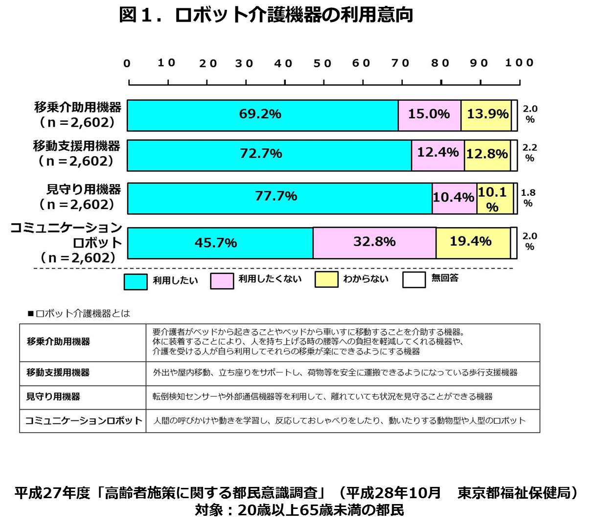 東京都福祉保健局では、平成28年10月、「高齢者対策に関する都民意識調査」の調査結果をリリースした。その中には、「ロボット介護機器の利用意向」及び「利用したくない理由」を問う設問も設けられており、興味深い。