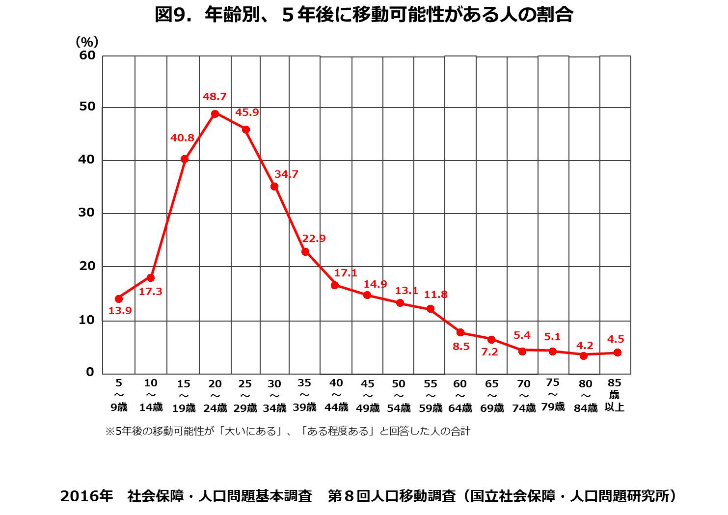 例外的なのが、85歳以上の年齢階級。中高年・高齢者の8つの年齢階級の中で唯一70%を割り込んでいる。自ら望んでの移動ではなく、療養や介護など拠所ない事情によるケースが多いからではないかと推察される。